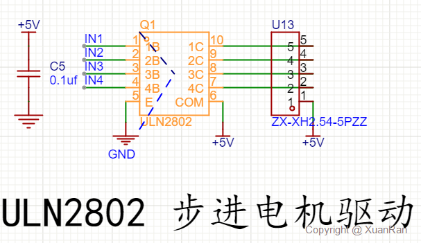 所以若要舵机和步进电机做个比较,可以简单的把舵机当作集成好的一体机,通电给PWM方波信号就行,而步进电机更像原始电机,需要控制不同的线圈进行转动,但是由于我们MCU引脚的驱动电路有限,所以我们要引入驱动芯片—ULB2802