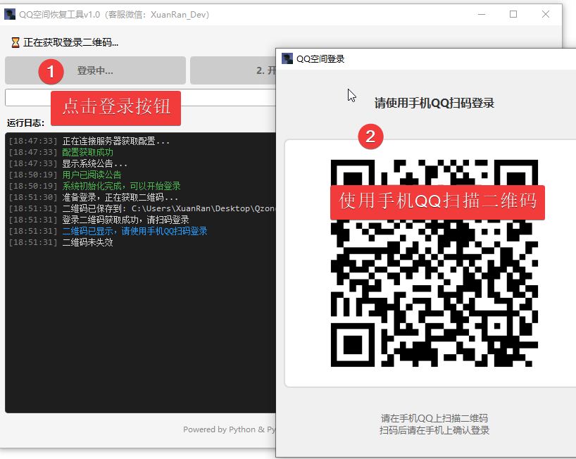 登录过程与 QQ 官方扫码一致,不需要输入账号密码。
