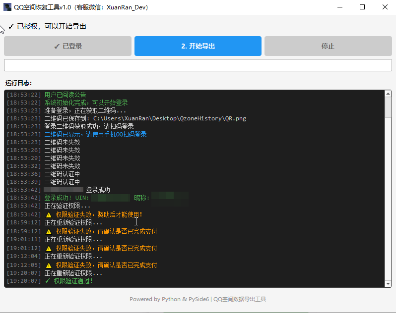 扫码成功后,二维码窗口会自动关闭,程序会开始进行权限检测。